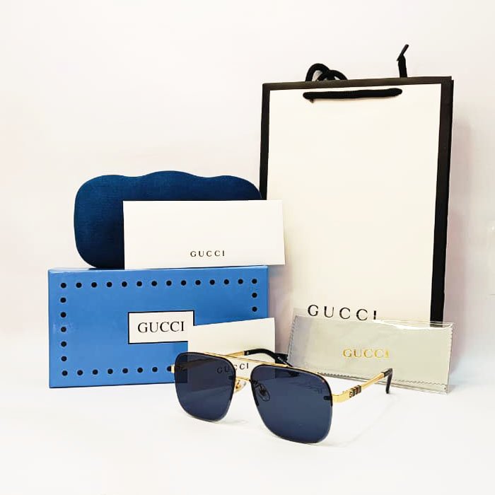These are likely a pair of Gucci men square or aviator-style sunglasses with a gold metal frame and blue lenses. Based on visual matches and product descriptions from various retailers, similar models include the Gucci GG0318 gold black, GG1495S, GG1513S, or GG1099SA.