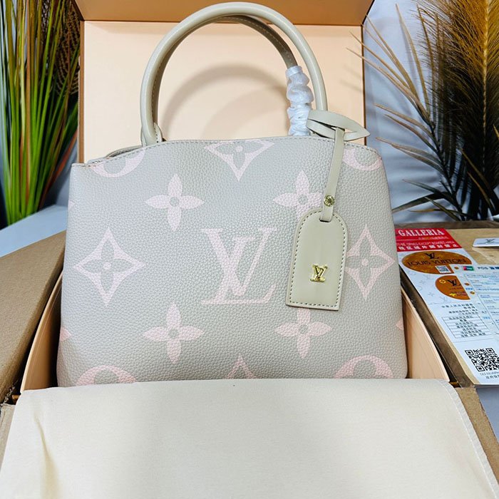 Elegance meets contemporary charm with this Louis Vuitton Monogram Empreinte leather handbag. Crafted in a soft beige tone and adorned with pastel pink oversized LV monogram motifs, this designer piece exudes quiet luxury and feminine sophistication. The structured silhouette is complemented by rolled leather handles and a chic luggage tag featuring a gold LV emblem for a refined touch.