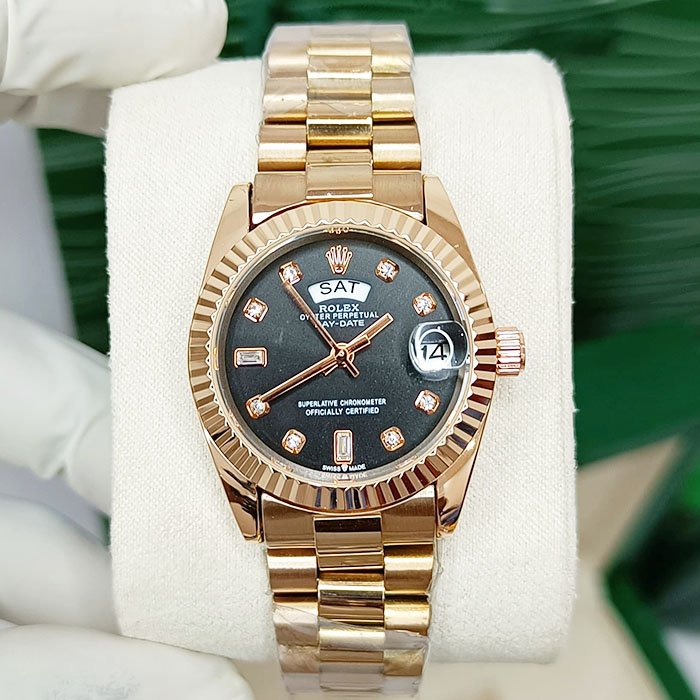 Elevate your wristwear with the timeless sophistication of the Rolex Day-Date Oyster Perpetual. Crafted in polished rose gold, this iconic watch features a bold black dial adorned with luminous diamond hour markers, offering a striking contrast that radiates elegance.
