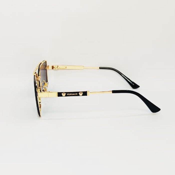 These are likely the Versace Medusa Biggie square-frame sunglasses, a distinctive style featuring bold, thick temples adorned with a prominent gold-tone Medusa emblem.