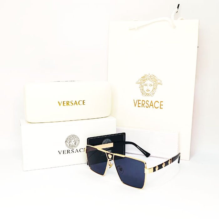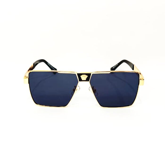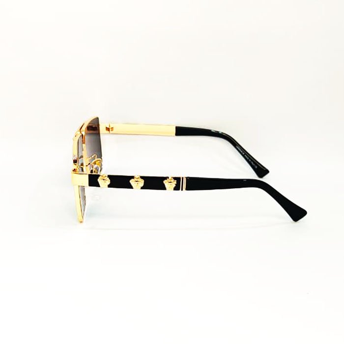 - Design: These full-rim sunglasses feature a bold, irregular, or square shape with a gold-tone metal frame and dark grey lenses. They have wide temples embellished with the iconic gold-tone Medusa medallion, a signature of the brands opulent style.